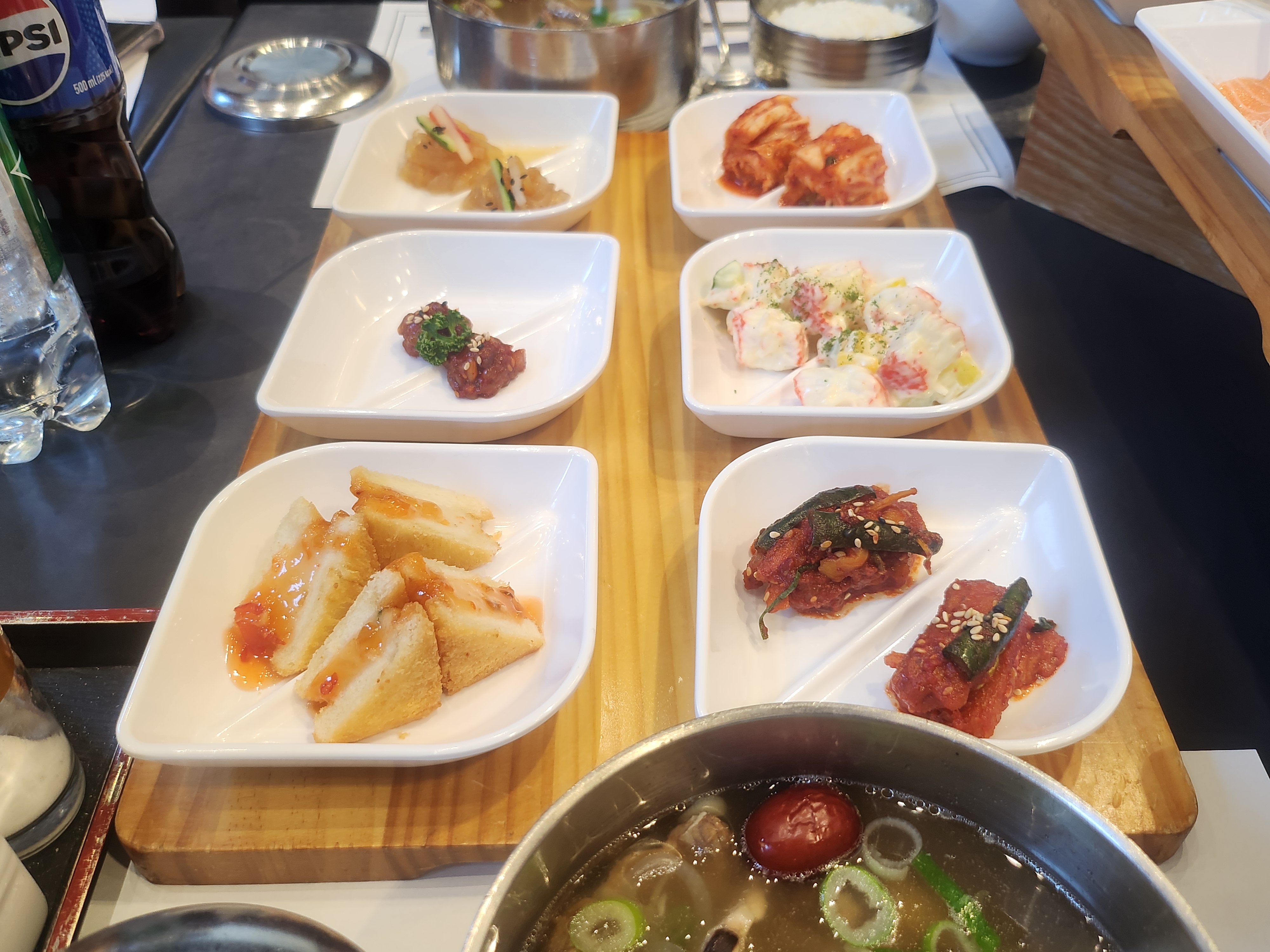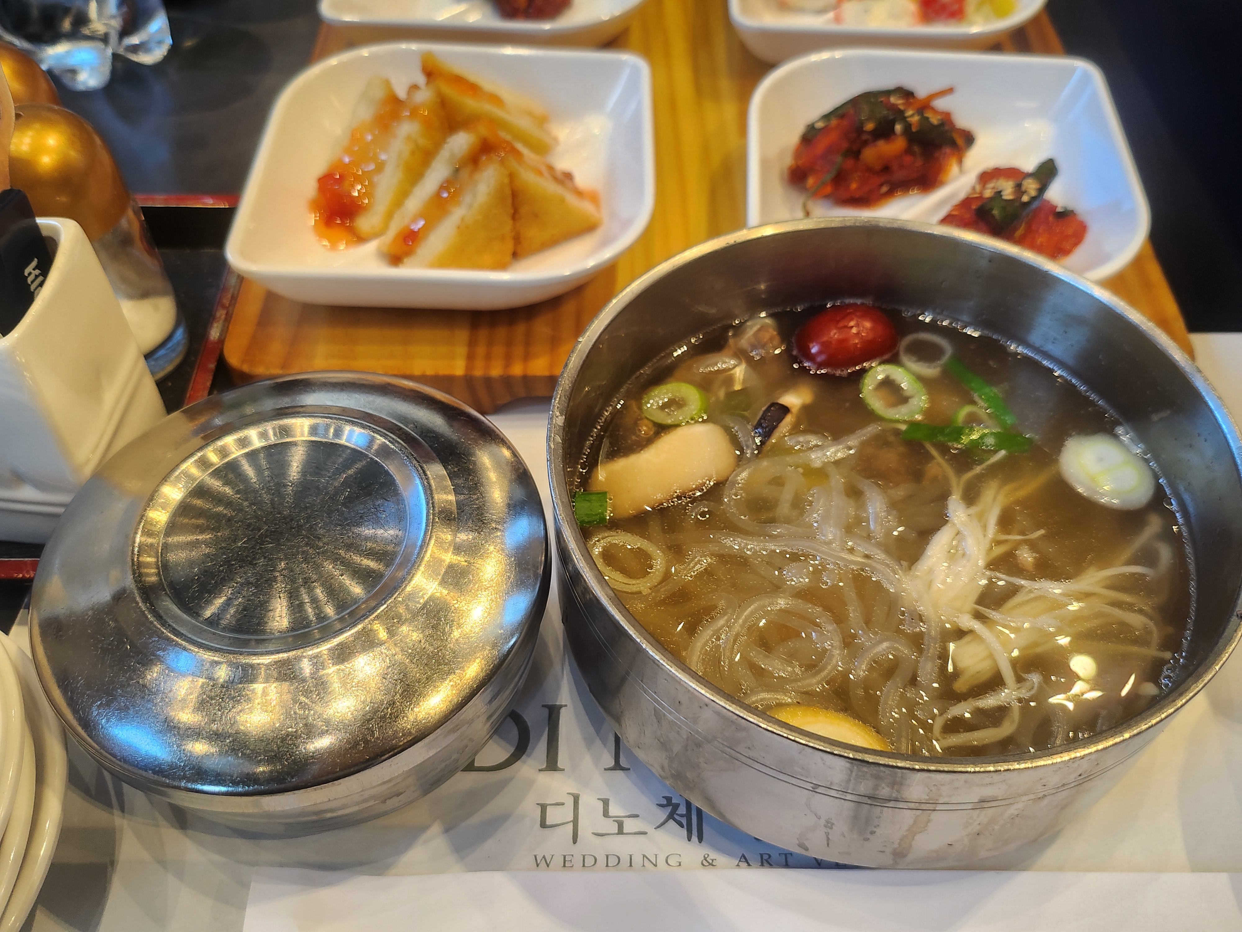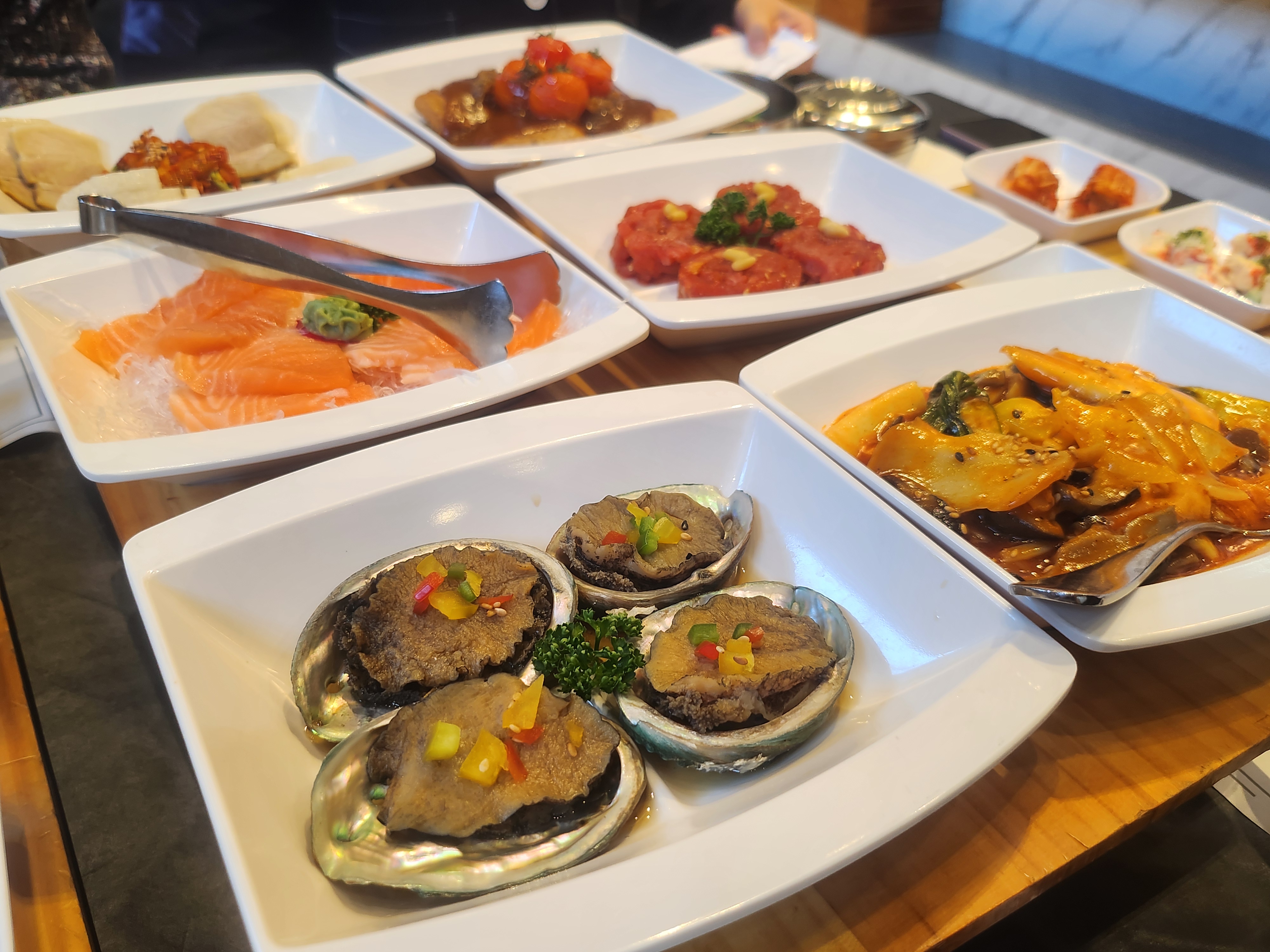 갈비탕, 연어, 전복, 육회, 팔보채, 보쌈, 함박스테이크 등이 인원수에 맞게 나옵니다.